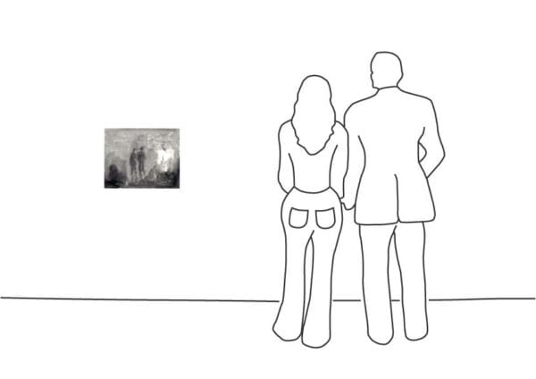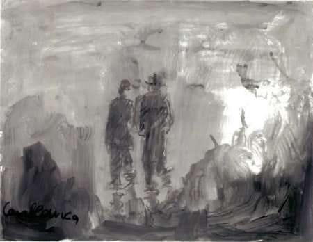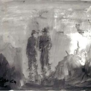 Original-Giclée-Print auf Hahnemühle-Bütten Wer kennt nicht die berühmte Schluss-Szene aus dem Kultfilm Casablanca, die Worte zum Abschied gewechselt auf dem Flughafen schemenhaft in Schwarz-Weiss zwischen Humphrey Bogart (als Rick, der Café-Bestitzer) und Claude Rains (als Captain Louis Renault, der Polizeichef vor Ort). Auf wunderbare Weise fängt Armin Mueller-Stahl hier die Stimmung ein durch Reduktion auf zwei Figuren