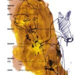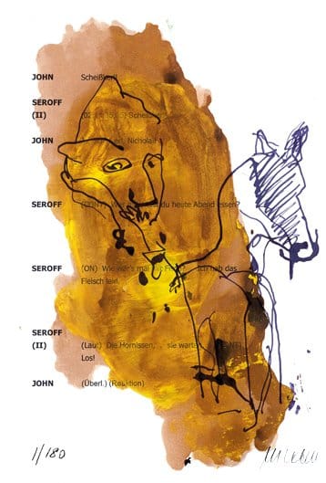 Farblithographie über Drehbuchtext