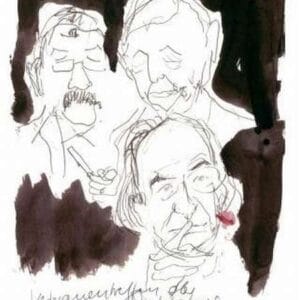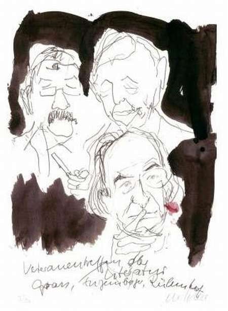 (Günter Grass, Peter Rühmkorf, Hans Magnus Enzensberger) Original-Giclée-Print auf Hahnemühle-Bütten Mit einem gewissen Augenzwinkern fing Armin Mueller-Stahl bereits 2008 die Heroen der westdeutschen Nachkriegsliteratur in wenigen, aber markant-treffsicheren Strichen ein