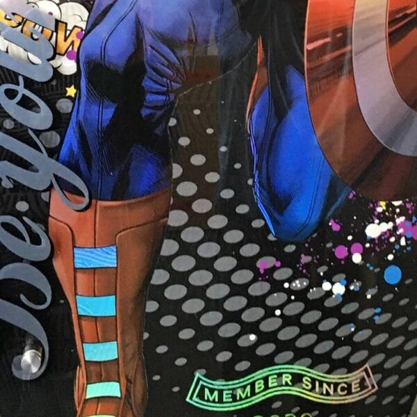 Das Kunstwerk Captain Amerika – Steve Rogers hat die Maße 93 x 50 cm in einer Edition – Auflage 99. Es ist ein Mixed Media, Lack auf Aluminium unter Plexiglas mit Handsiebdruck, Spiegelfarbe, signiert und nummeriert.