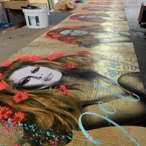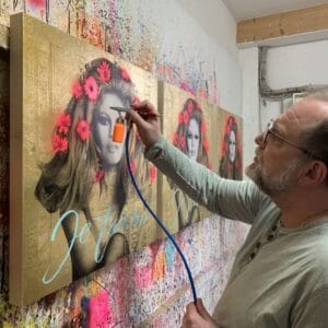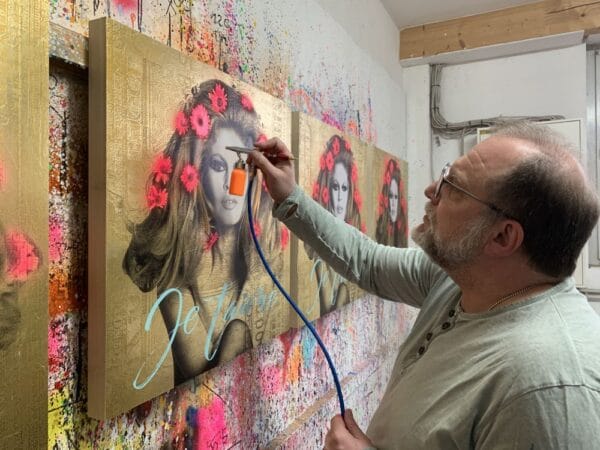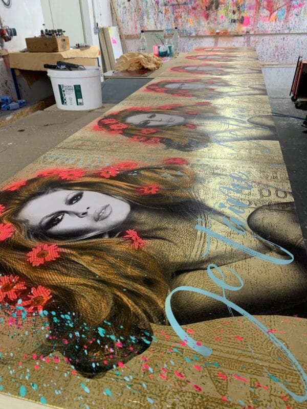 Diese wunderschöne Arbeit wird aufwendig gespachtelt und ist liebevoll mit Blattgold hinterlegt worden. Die lebendigen, knalligen Farben umschmeicheln Brigitte Bardot, die im klassischen Siebdruckverfahren aufgebracht wurde.
