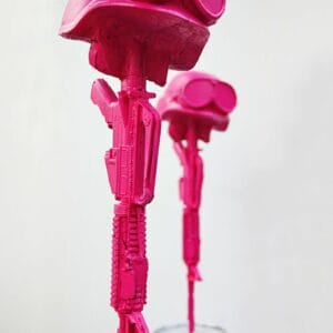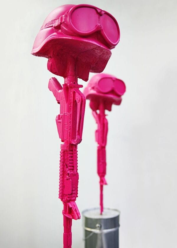 Die Plastik ist eine 3D Visualisierung eines bekannten Bildes aus dem Golfkrieg, als die ersten amerikanischen Solfaten fielen, war das aufgepflanzte M16 Schnellfeuergewehr mit Helm und Dogtags das Bild des Kriegstoten und des provisorischen Kriegsgrabes. Jedoch schon zu Kriegsende ´45 war Berlin übersäht mit diesem Bild (damals noch der gute alte 98K Karabiner) und soll als Kunstwerk den Toten in aller Welt durch kriegerische Auseinandersetzungen gedenken. Titel: D.O.W – Death of war Masse mit Sockel: ca. 125 cm x 30 cm x40 cm Material: Stahlbetonguss Gewicht: ca.40 Kilo
