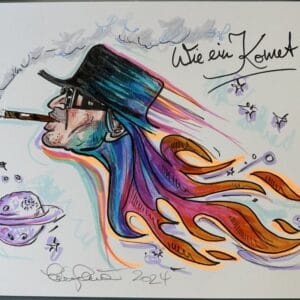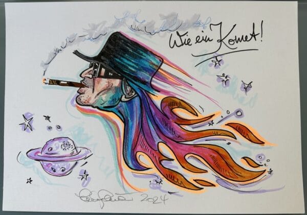 Karikatur „Wie ein Komet (Udo Lindenberg)“ auf Büttenpapier