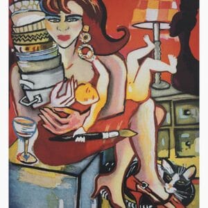 Der Pinsel gibt einen Hinweis, vielleicht handelt es sich bei diesem Motiv, die Grafik geht auf ein gleichnamiges Gemälde der Künstlerin zurück, ja um ein Selbstbildnis. „Kunst und Leben gehören zusammen“, sagt die Künstlerin. (Farbradierung von 4 Platten, Aquatinta)