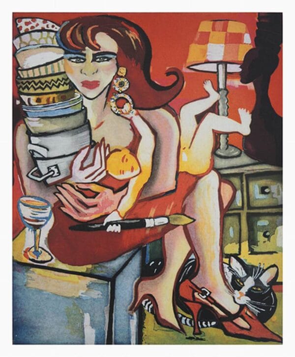 „Eine Frau muss alles machen: Mutter, Ehefrau und Arbeiterin sein. Es ist eine Gratwanderung, was von ihr erwartet wird“, sagt die Künstlerin Elvira Bach, angesprochen auf Ihre Arbeit „24 hours“. Zu erkennen ist eine Frau, die alles ist und alles gleichzeitig tun muss: mit Kind auf dem Arm, dreckigem Geschirr im anderen, hochhackigen Schuhen und Pinsel in der Hand.
