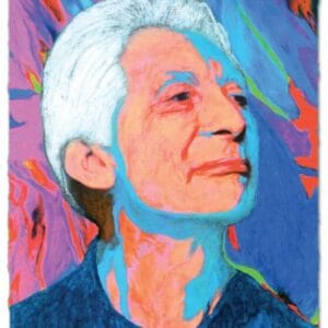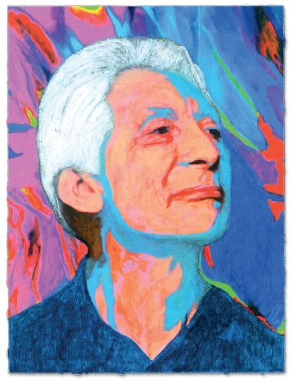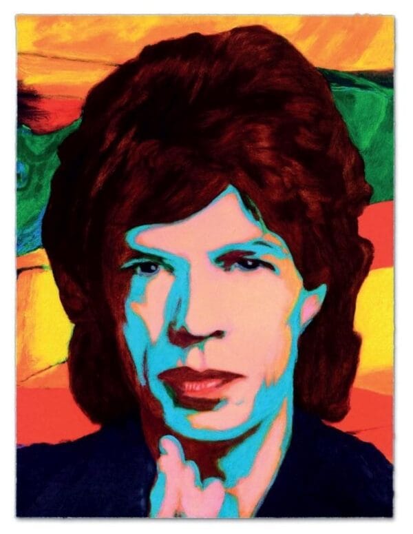 Der Frontmann der britischen Rockgruppe wurde von Gill mit schillernden Farbfacetten im Hintergrund porträtiert. Die Farben sind so auffallend und bewegend wie das Leben von Mick.