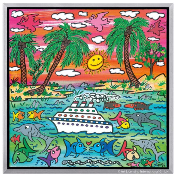 Das Bild „A SUNSET CRUISE“ von James Rizzi ist ein atemberaubendes 3D-Bild, das jede Wand in Ihrem Zuhause zum Leben erwecken wird. Es zeigt eine Gruppe Menschen auf einer Kreuzfahrt bei Sonnenuntergang. Die Farben sind lebhaft und die Details des Bootes und der Landschaft sind klar und deutlich zu sehen. Die 3D-Elemente machen es noch realistischer und versetzen Sie direkt an den Ort des Geschehens. Dieses Kunstwerk wird Ihr Zimmer mit Wärme und Freude füllen und alle Besucher beeindrucken. Mit diesem schönen Bild werden Sie immer an Ihre besonderen Reisen erinnert werden – Mit James Rizzi in den Urlaub!