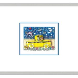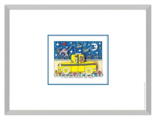 Das mag wohl auch der Grund für seinen Erfolg gewesen sein. Schon zu Zeiten, als eine künstlerische Laufbahn in weiter Ferne lag, fanden Rizzis Kreationen reißenden Absatz. Der damalige BWL-Student malte ausschließlich zur Entspannung und verkaufte die so entstehenden Werke an Kommilitonen. Vom Erfolg beflügelt schrieb er sich 1969 an der University of Florida in Gainesville ein. Hier begann er mit verschiedenen Ausdrucksformen zu experimentieren. Aus der Zusammenführung von Malerei und Skulptur entwickelte James Rizzi schließlich die 3D-Grafik – eine Technik, bei der einzelne Bildelemente dupliziert und übereinander geschichtet werden. Sie machte den New Yorker ab 1974 zum Shooting-Star der Kunst-Szene und zu einem der bedeutendsten Vertreter der Pop-Art. So passt auch das Motiv „A Taxi trough the Night“