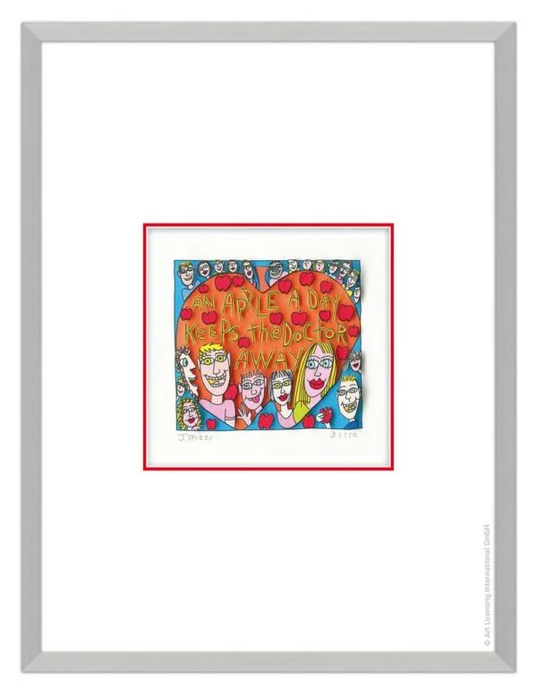 „An Apple A Day Keeps The Doctor Away“, ist eine original 3-D Grafik des im Dezember 2011 verstorbenen New Yorker Neo-Pop-Art-Künstlers James Rizzi. Wir hatten eine sehr enge Beziehung zu James und waren mit die erste Galerie in Deutschland die ihn ausstellte.
