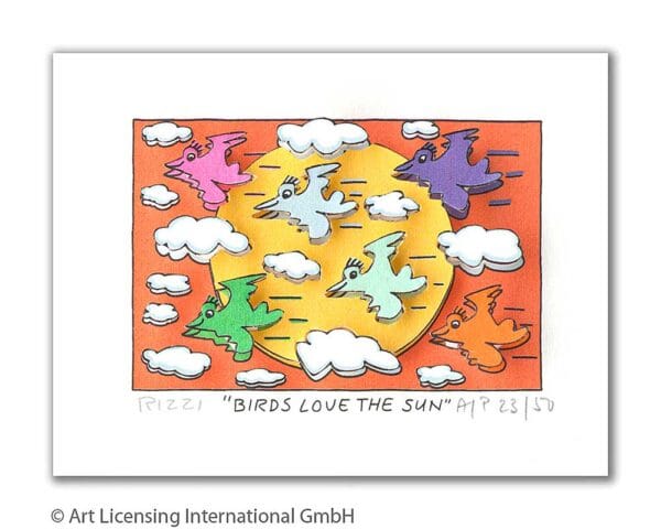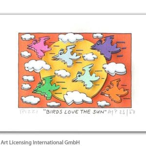 „Birds Love The Sun“, ist eine original 3-D Grafik des im Dezember 2011 verstorbenen New Yorker Neo-Pop-Art-Künstlers James Rizzi. Wir hatten eine sehr enge Beziehung zu James und waren mit die erste Galerie in Deutschland die ihn ausstellte.