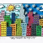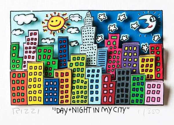 „Day + Night in my City“, ist eine original 3-D Grafik des im Dezember 2011 verstorbenen New Yorker Neo-Pop-Art-Künstlers James Rizzi. Wir hatten eine sehr enge Beziehung zu James und waren mit die erste Galerie in Deutschland die ihn ausstellte.