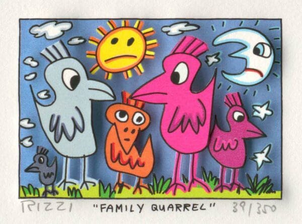 „Family Quarrel“, ist eine original 3-D Grafik des im Dezember 2011 verstorbenen New Yorker Neo-Pop-Art-Künstlers James Rizzi. Wir hatten eine sehr enge Beziehung zu James und waren mit die erste Galerie in Deutschland die ihn ausstellte.