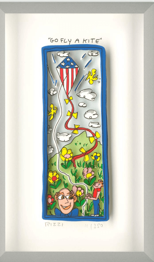 Die „Go to“ Bilder von James Rizzi kommen mit einem Aluminium Rahmen (Silber) und Museumsglas.
