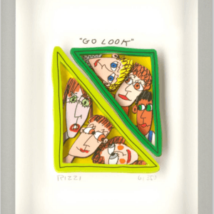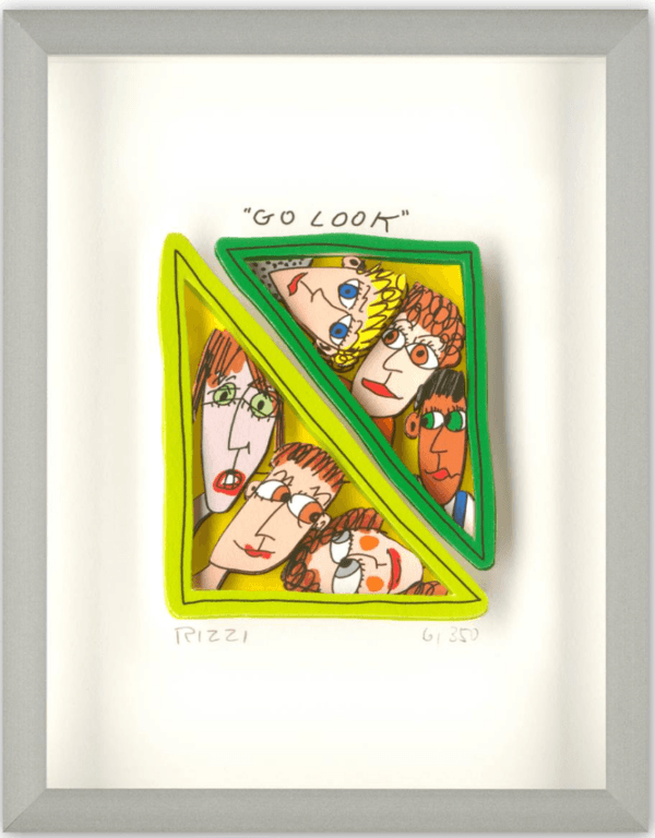 Die „Go to“ Bilder von James Rizzi kommen mit einem Aluminium Rahmen (Silber) und Museumsglas.