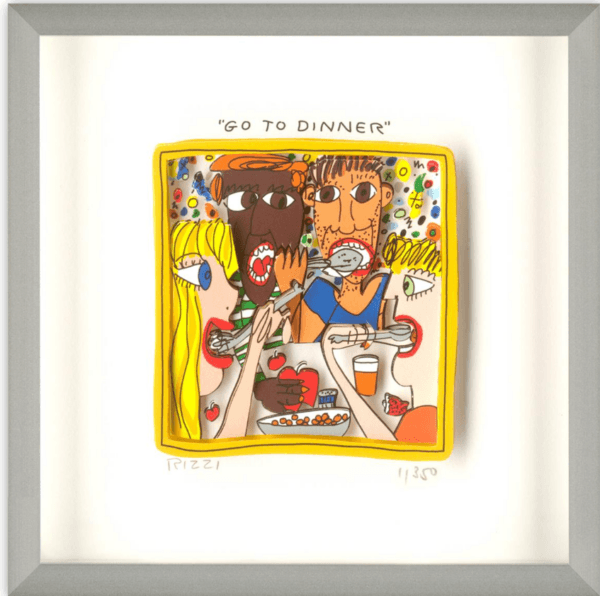 Die „Go to“ Bilder von James Rizzi kommen mit einem Aluminium Rahmen (Silber) und Museumsglas.