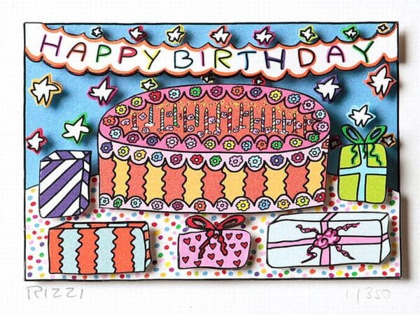 „Happy Birthday“, ist eine original 3-D Grafik des im Dezember 2011 verstorbenen New Yorker Neo-Pop-Art-Künstlers James Rizzi. Wir hatten eine sehr enge Beziehung zu James und waren mit die erste Galerie in Deutschland die ihn ausstellte.