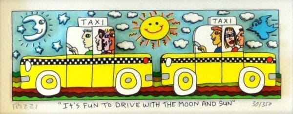 „It’s Fun To Drive With The Moon And Sun“, ist eine original 3-D Grafik des im Dezember 2011 verstorbenen New Yorker Neo-Pop-Art-Künstlers James Rizzi. Wir hatten eine sehr enge Beziehung zu James und waren mit die erste Galerie in Deutschland die ihn ausstellte.