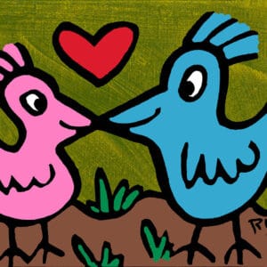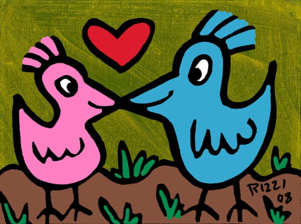 „Just Like Love Birds“, ist ein Limitierter Siebdruck in einem Schattenfugenrahmen des im Dezember 2011 verstorbenen New Yorker Neo-Pop-Art-Künstlers James Rizzi. Wir hatten eine sehr enge Beziehung zu James und waren mit die erste Galerie in Deutschland die ihn ausstellte.
