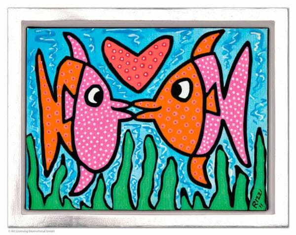 „Kissie Fishie“, ist ein Limitierter Siebdruck in einem Schattenfugenrahmen des im Dezember 2011 verstorbenen New Yorker Neo-Pop-Art-Künstlers James Rizzi. Wir hatten eine sehr enge Beziehung zu James und waren mit die erste Galerie in Deutschland die ihn ausstellte.