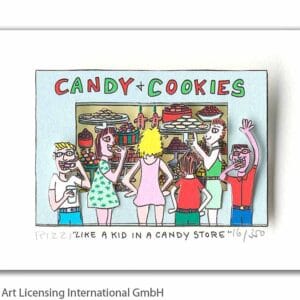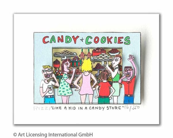 „Like A Kid In A Candy Store“, ist eine original 3-D Grafik des im Dezember 2011 verstorbenen New Yorker Neo-Pop-Art-Künstlers James Rizzi. Wir hatten eine sehr enge Beziehung zu James und waren mit die erste Galerie in Deutschland die ihn ausstellte.