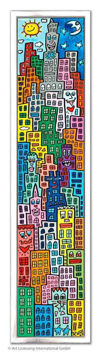 „Living On A Rainbow Road“, ist ein limitierter Siebdruck in einem Schattenfugenrahmen des im Dezember 2011 verstorbenen New Yorker Neo-Pop-Art-Künstlers James Rizzi. Wir hatten eine sehr enge Beziehung zu James und waren mit die erste Galerie in Deutschland die ihn ausstellte.