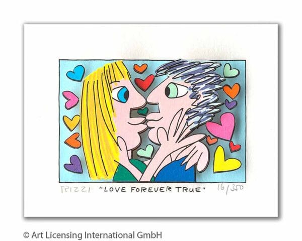„Love Forever True“, ist eine original 3-D Grafik des im Dezember 2011 verstorbenen New Yorker Neo-Pop-Art-Künstlers James Rizzi. Wir hatten eine sehr enge Beziehung zu James und waren mit die erste Galerie in Deutschland die ihn ausstellte.