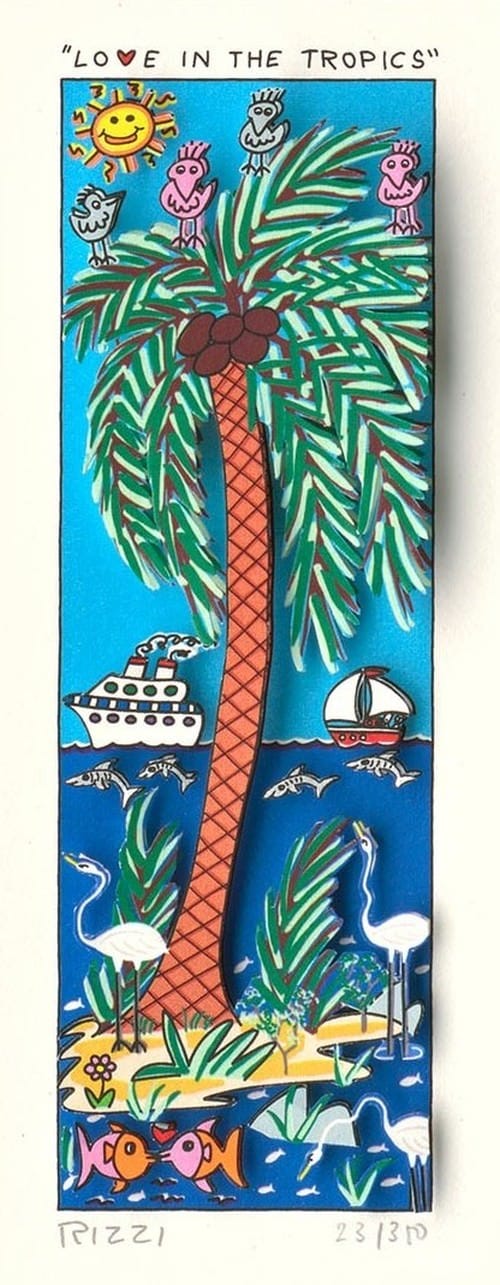 „Love in the Tropics“, ist eine original 3-D Grafik des im Dezember 2011 verstorbenen New Yorker Neo-Pop-Art-Künstlers James Rizzi. Wir hatten eine sehr enge Beziehung zu James und waren mit die erste Galerie in Deutschland die ihn ausstellte.