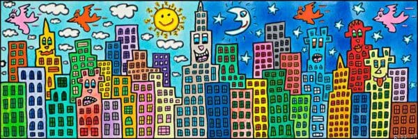 James Rizzi ist durch seine 3-D Grafiken weltbekannt geworden. Seine Themen fand James Rizzi in seiner Heimatstadt NYC, die er in den 3-D Grafiken in seinem einzigartigen Stil umgesetzt hat.