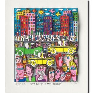 „My City Is My Friend“, ist eine original 3-D Grafik des im Dezember 2011 verstorbenen New Yorker Neo-Pop-Art-Künstlers James Rizzi. Wir hatten eine sehr enge Beziehung zu James und waren mit die erste Galerie in Deutschland die ihn ausstellte.