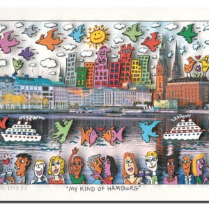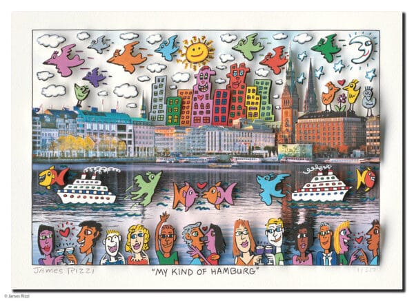„My Kind Of Hamburg“, ist eine original 3-D Grafik des im Dezember 2011 verstorbenen New Yorker Neo-Pop-Art-Künstlers James Rizzi. Wir hatten eine sehr enge Beziehung zu James und waren mit die erste Galerie in Deutschland die ihn ausstellte.Diese Arbeit hat er noch vor seinem Tod entworfen und damals für die Veröffentlichung freigegeben, die Montage ist nun ausgeführt worden. Diese 3-D Grafik ist auch aktuell limitiert, im Druck signiert und wurde von Hand nummeriert. Die Echtheit wird durch ein einzigartiges Hologramm garantiert!