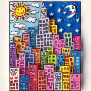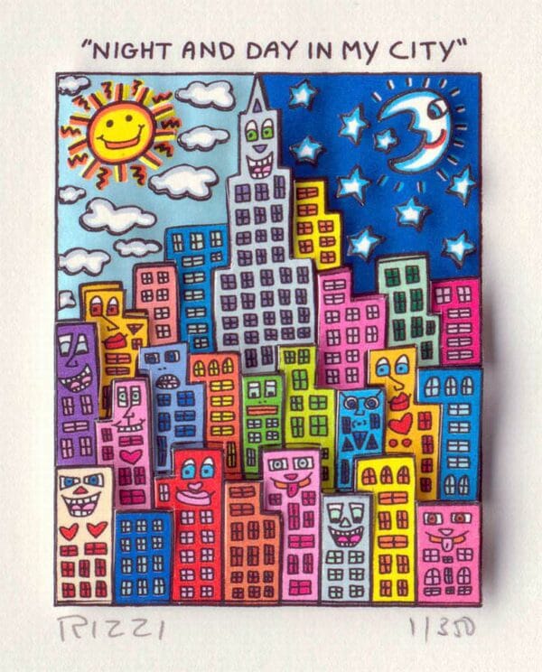 „Night and Day in my City“, ist eine original 3-D Grafik des im Dezember 2011 verstorbenen New Yorker Neo-Pop-Art-Künstlers James Rizzi. Wir hatten eine sehr enge Beziehung zu James und waren mit die erste Galerie in Deutschland die ihn ausstellte.Diese Arbeit hat er noch vor seinem Tod entworfen und damals für die Veröffentlichung freigegeben, die Montage ist nun ausgeführt worden. Diese 3-D Grafik ist auch aktuell limitiert, im Druck signiert und wurde von Hand nummeriert. Die Echtheit wird durch ein einzigartiges Hologramm suggeriert.