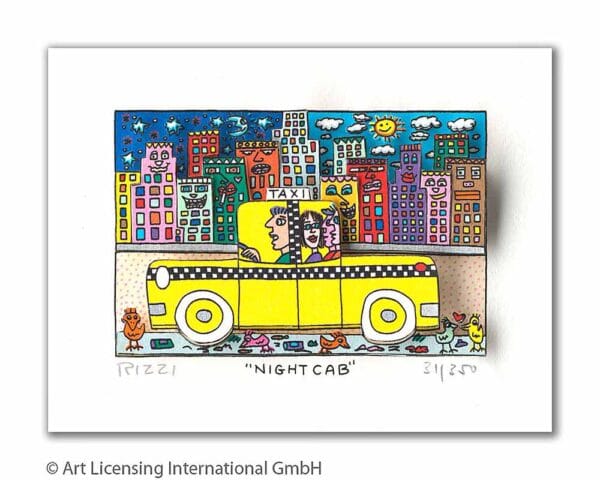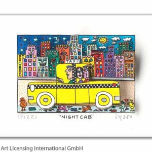 „Night Cab“, ist eine original 3-D Grafik des im Dezember 2011 verstorbenen New Yorker Neo-Pop-Art-Künstlers James Rizzi. Wir hatten eine sehr enge Beziehung zu James und waren mit die erste Galerie in Deutschland die ihn ausstellte.