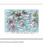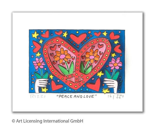 „Peace And Love“, ist eine original 3-D Grafik des im Dezember 2011 verstorbenen New Yorker Neo-Pop-Art-Künstlers James Rizzi. Wir hatten eine sehr enge Beziehung zu James und waren mit die erste Galerie in Deutschland die ihn ausstellte.