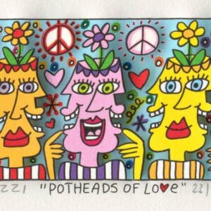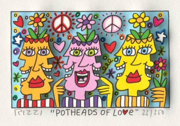 „Potheads of Love“, ist eine original 3-D Grafik des im Dezember 2011 verstorbenen New Yorker Neo-Pop-Art-Künstlers James Rizzi. Wir hatten eine sehr enge Beziehung zu James und waren mit die erste Galerie in Deutschland die ihn ausstellte.Diese Arbeit hat er noch vor seinem Tod entworfen und damals für die Veröffentlichung freigegeben, die Montage ist nun ausgeführt worden. Diese 3-D Grafik ist auch aktuell limitiert, im Druck signiert und wurde von Hand nummeriert. Die Echtheit wird durch ein einzigartiges Hologramm garantiert!