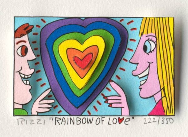 „Rainbow of Love“, ist eine original 3-D Grafik des im Dezember 2011 verstorbenen New Yorker Neo-Pop-Art-Künstlers James Rizzi. Wir hatten eine sehr enge Beziehung zu James und waren mit die erste Galerie in Deutschland die ihn ausstellte.Diese Arbeit hat er noch vor seinem Tod entworfen und damals für die Veröffentlichung freigegeben, die Montage ist nun ausgeführt worden. Diese 3-D Grafik ist auch aktuell limitiert, im Druck signiert und wurde von Hand nummeriert. Die Echtheit wird durch ein einzigartiges Hologramm garantiert!