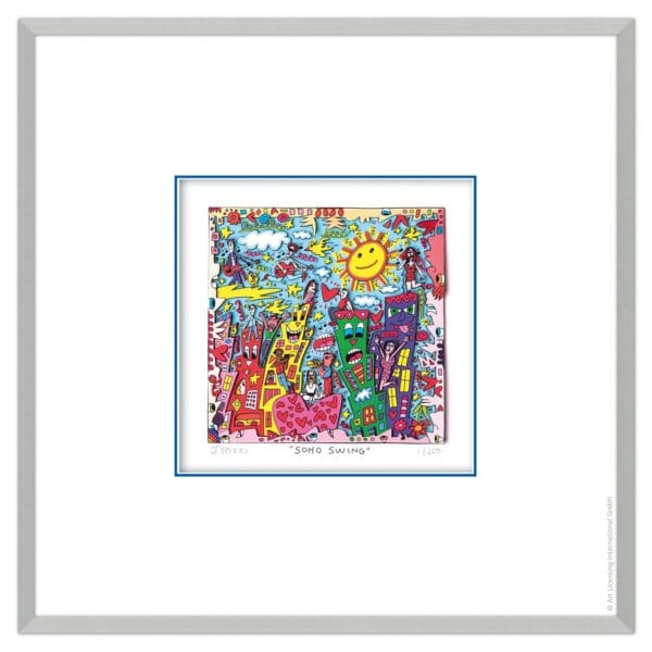 „Soho Swing“, ist eine original 3-D Grafik des im Dezember 2011 verstorbenen New Yorker Neo-Pop-Art-Künstlers James Rizzi. Wir hatten eine sehr enge Beziehung zu James und waren mit die erste Galerie in Deutschland die ihn ausstellte.
