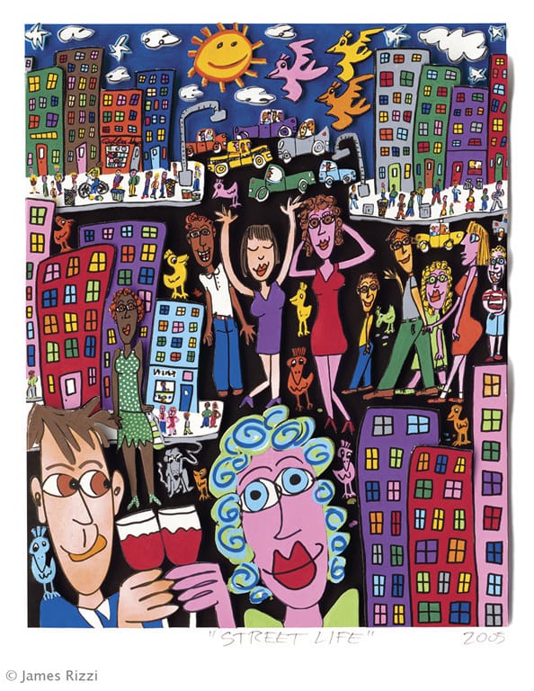 Die handsignierte 3D Grafik „Street Life“, die James Rizzi versehentlich mit „Street Action“ betitelt hat.