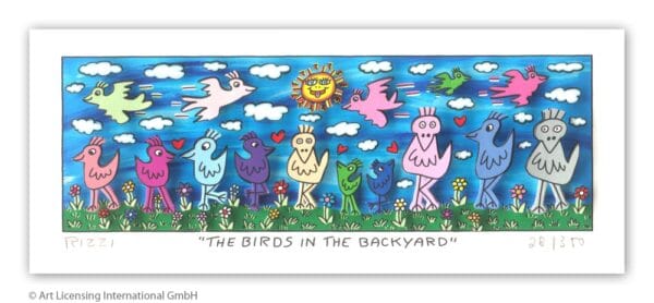 The Birds in the Backyard von James Rizzi ist ein wunderschönes Kunstwerk, das die Natur und die Schönheit der Vögel feiert. Mit lebendigen Farben und kunstvollen Details erweckt es jeden Raum zum Leben. Der Druck auf hochwertigem Papier zeigt eine Reihe bunter Vögel, die sich um einen Vogelkäfig versammeln. Dieses Meisterwerk wird Ihre Wohnzimmermöbel sofort verzieren und Ihnen Freude bereiten. Es ist ein perfektes Geschenk für alle Tierliebhaber und Kunstfans. Genießen Sie die Energie und den Charme dieses schönen Bildes!