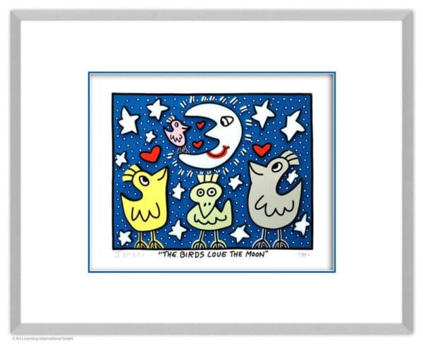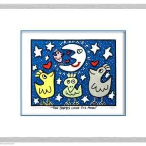 „The Birds Love the Moon“ von James Rizzi ist ein atemberaubendes Kunstwerk, das die Freude und Schönheit des Lebens widerspiegelt. Es zeigt eine Gruppe bunter Vögel, die vor dem hellen Mond schweben. Diese lebensechte Darstellung ermöglicht es Ihnen, sich in diesem Moment zu verlieren und den Zauber der Natur zu spüren. Die Farben des Bildes sind frisch und lebendig und machen es zu einem perfekten Dekorationsobjekt für jeden Raum. Mit seiner beruhigenden Atmosphäre wird „The Birds Love the Moon“ von James Rizzi ein kostbarer Begleiter auf Ihrer Reise ins Unbekannte sein.