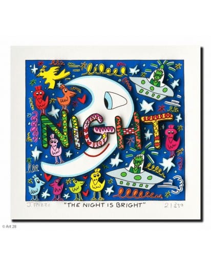 „The Night is Bright“, ist eine original 3-D Grafik des im Dezember 2011 verstorbenen New Yorker Neo-Pop-Art-Künstlers James Rizzi. Wir hatten eine sehr enge Beziehung zu James und waren mit die erste Galerie in Deutschland die ihn ausstellte.Diese Arbeit hat er noch vor seinem Tod entworfen und damals für die Veröffentlichung freigegeben, die Montage ist nun ausgeführt worden. Diese 3-D Grafik ist auch aktuell limitiert, im Druck signiert und wurde von Hand nummeriert. Die Echtheit wird durch ein einzigartiges Hologramm suggeriert.