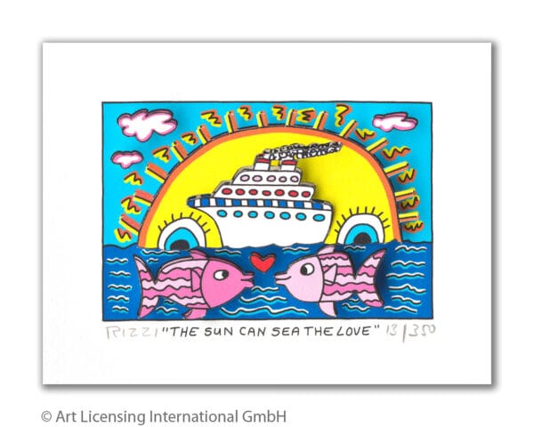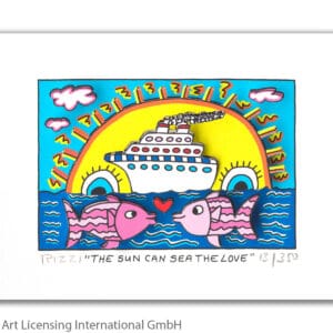 „The Sun Can Sea The Love“, ist eine original 3-D Grafik des im Dezember 2011 verstorbenen New Yorker Neo-Pop-Art-Künstlers James Rizzi. Wir hatten eine sehr enge Beziehung zu James und waren mit die erste Galerie in Deutschland die ihn ausstellte.