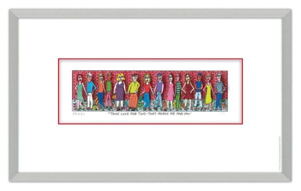 „True Love For Two – That Means Me …“, ist eine original 3-D Grafik des im Dezember 2011 verstorbenen New Yorker Neo-Pop-Art-Künstlers James Rizzi. Wir hatten eine sehr enge Beziehung zu James und waren mit die erste Galerie in Deutschland die ihn ausstellte.Diese Arbeit hat er noch vor seinem Tod entworfen und damals für die Veröffentlichung freigegeben, die Montage ist nun ausgeführt worden. Diese 3-D Grafik ist auch aktuell limitiert, im Druck signiert und wurde von Hand nummeriert. Die Echtheit wird durch ein einzigartiges Hologramm garantiert.
