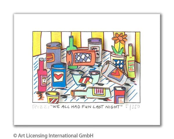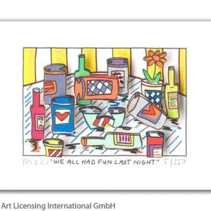 „We All Had Fun Last Night“, ist eine original 3-D Grafik des im Dezember 2011 verstorbenen New Yorker Neo-Pop-Art-Künstlers James Rizzi. Wir hatten eine sehr enge Beziehung zu James und waren mit die erste Galerie in Deutschland die ihn ausstellte.