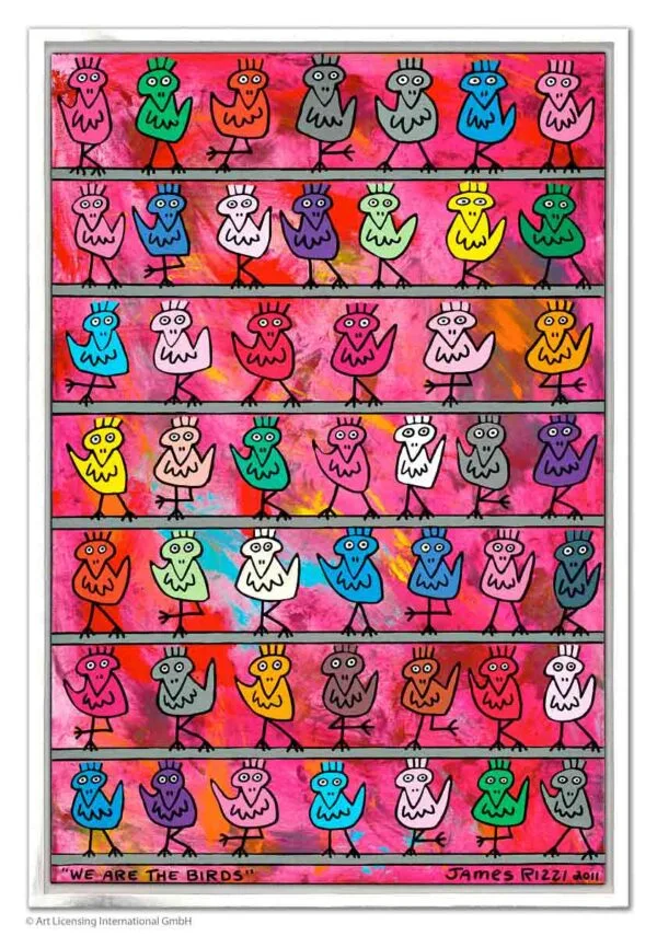 „We are the Birds“, ist ein Limitierter Siebdruck in einem Schattenfugenrahmen des im Dezember 2011 verstorbenen New Yorker Neo-Pop-Art-Künstlers James Rizzi. Wir hatten eine sehr enge Beziehung zu James und waren mit die erste Galerie in Deutschland die ihn ausstellte.