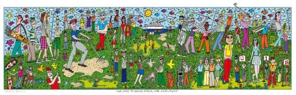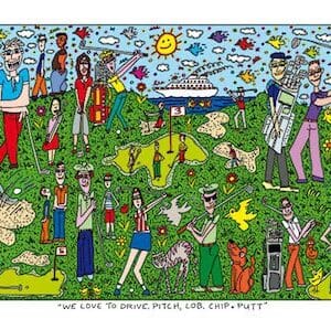„We Love To Drive, Pitch, Lob, Chip + Putt“, ist eine original 3-D Grafik des im Dezember 2011 verstorbenen New Yorker Neo-Pop-Art-Künstlers James Rizzi. Wir hatten eine sehr enge Beziehung zu James und waren mit die erste Galerie in Deutschland die ihn ausstellte.Diese Arbeit hat er noch vor seinem Tod entworfen und damals für die Veröffentlichung freigegeben, die Montage ist nun ausgeführt worden. Diese 3-D Grafik ist auch aktuell limitiert, im Druck signiert und wurde von Hand nummeriert. Die Echtheit wird durch ein einzigartiges Hologramm garantiert.