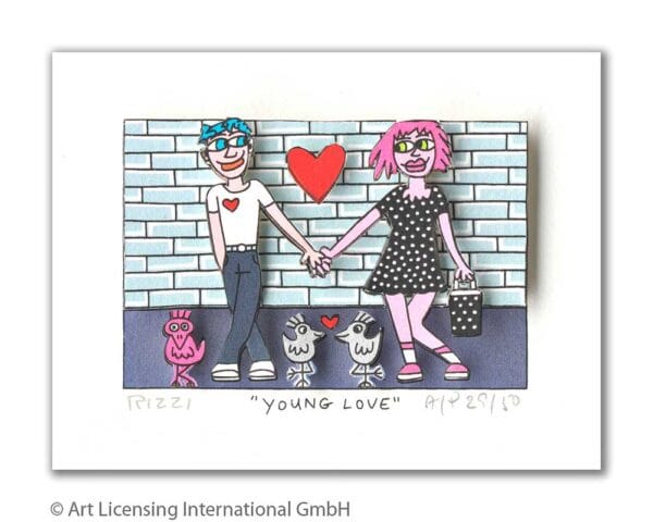 „Young Love“, ist eine original 3-D Grafik des im Dezember 2011 verstorbenen New Yorker Neo-Pop-Art-Künstlers James Rizzi. Wir hatten eine sehr enge Beziehung zu James und waren mit die erste Galerie in Deutschland die ihn ausstellte.