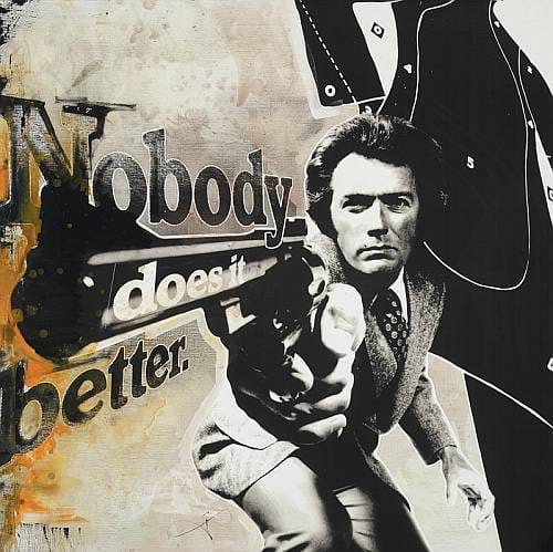 Eastwood ist einer der großen und coolen Jungs die JD in seinem Schaffen pflegt und hegt. Nicht ohne Grund, denn wer sagt mit weniger mehr ? Es gab vor Jahren eine ähnliche Szene als Serigrafie von JD. Diese hier ist noch dramatischer in der Perspektive, noch ausdruckstärker durch die größeren Farbkontraste. JD bekam die Option das Bild zu nutzen und hat es gerne in ein Werk umgesetzt…