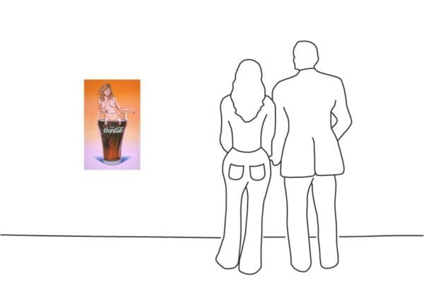 Das Motiv zeigt eine nackte Frau, die in ein Coca-Cola-Glas steht. Das Glas ist bis zum Becken der Frau mit Cola gefüllt. Die lächelnde, langhaarige blonde Frau lehnt sich entspannt mit den Ellenbogen auf den Glasrand und schaut den Betrachter an. Den Hintergrund bildet ein Farbverlauf von orange hin zu fliederfarben, im unteren Drittel.
