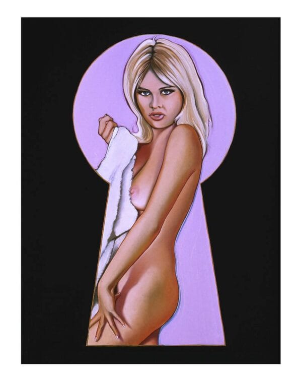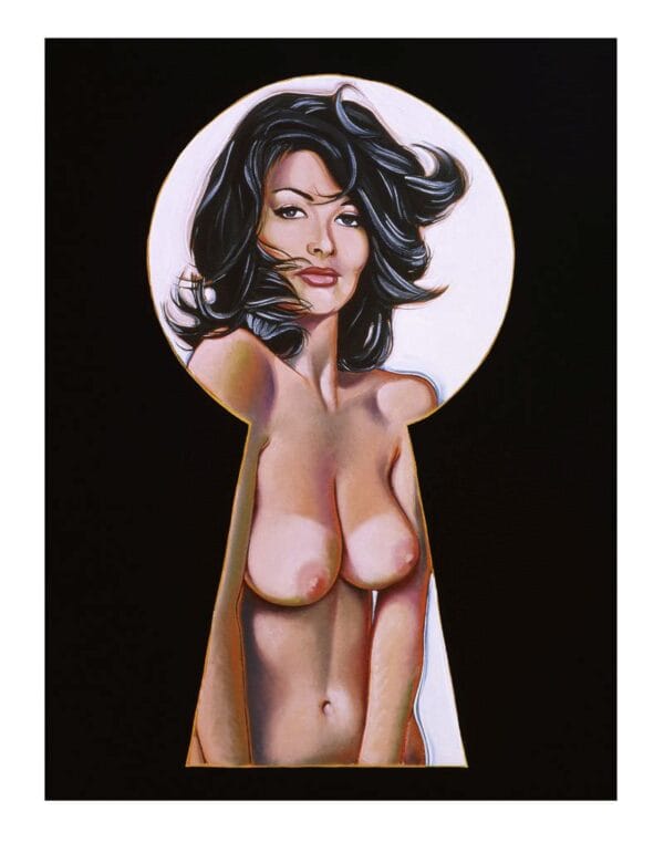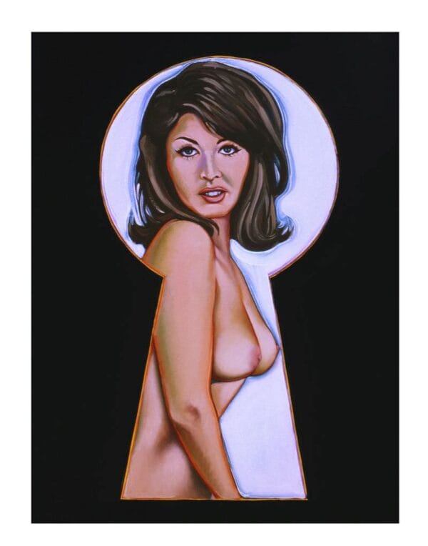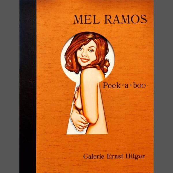 Mel Ramos präsentiert in seinem Portfolio „Peek-a-boo“ sechs einzigartige Motive auf je einem Blatt. Dieses ursprüngliche Meisterstück grafischer Pop-Art thematisiert beobachtende Heimlichkeit demonstrativ: Jede einzelne Zeichnung beschreibt einen weiblichen Akt, betrachtet durch das stilisierte, einrahmende Schlüsselloch. Auch in diesem Œuvre des Kaliforniers vereinen sich damit wieder Abstraktes und Realismus.