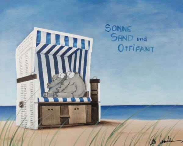Für alle, die sich ein bisschen Urlaubsgefühl und Entspannung nach Hause holen möchten, gibt es ab sofort das Bild »Sonne, Sand & Ottifant« als limitierte Edition auf Leinwand.